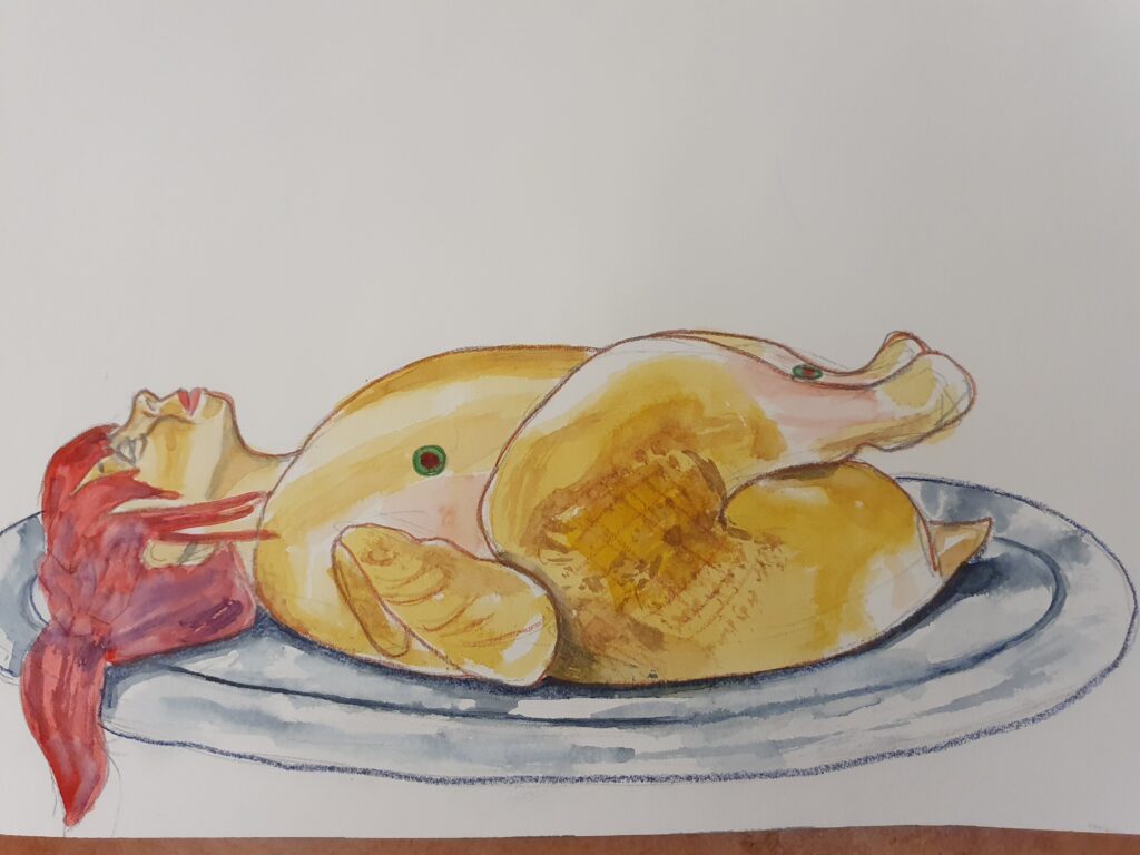 This was inspired by when I thought I had cancer in both my breast and leg and it did make me feel a bit like a roast chicken and that saying re breast and leg. I thought it would make for a surreal image and decided to go for it. It also alludes to the surgeon specialities that will be operating. From yet another angle it brings us down to the fact that we can be treated very much like a piece of meat that needs curing, due to the massive numbers of people that the NHS is dealing with. And again alludes to the fact that in todays society by some sexist people we are viewd as a piece of meat rather than a person. so it works on multiple levels although the initial thought was to bring some humour to my situation.