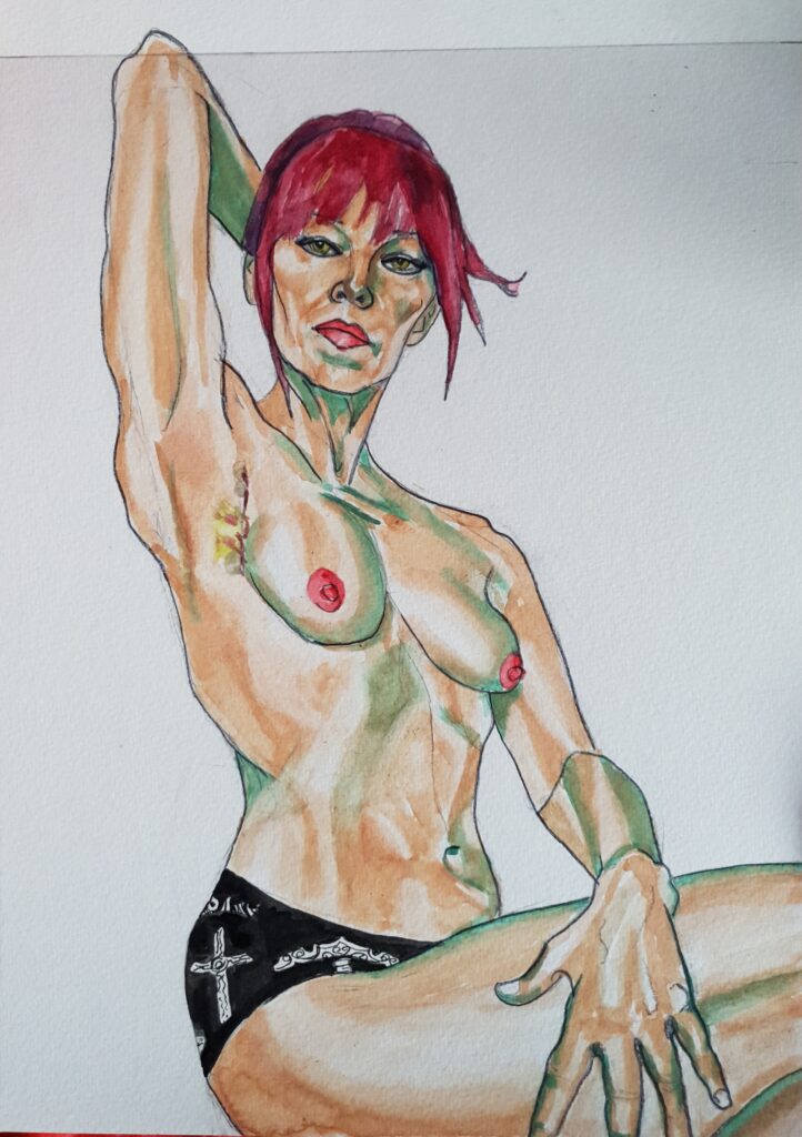 Cancer portrait no 16 showing the affects of radiotherapy on the skin and the side effect I have called cording, which can be seen in the armpit where the collagen has reacted and healed into a cord like structure that will require massage and physiotherapy. I am having to moisturise the burnt skin 3 times a day and that will be going on for a while, Its still somewhat sensitive and swollen, but think its improved a wee bit.